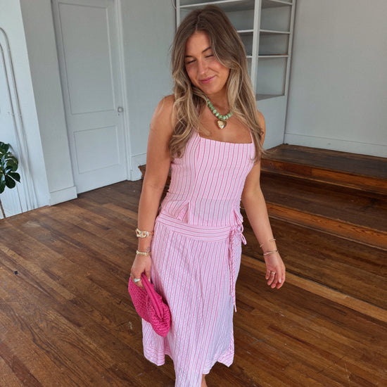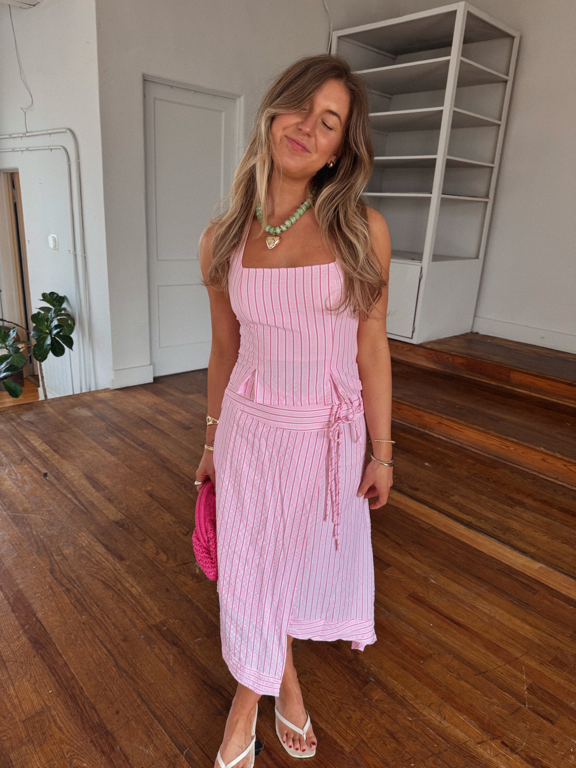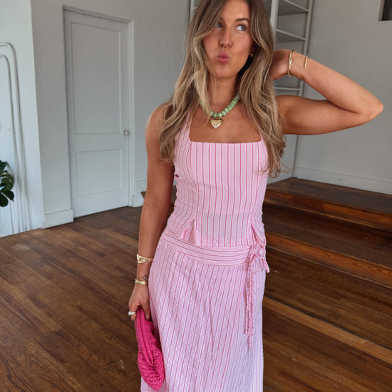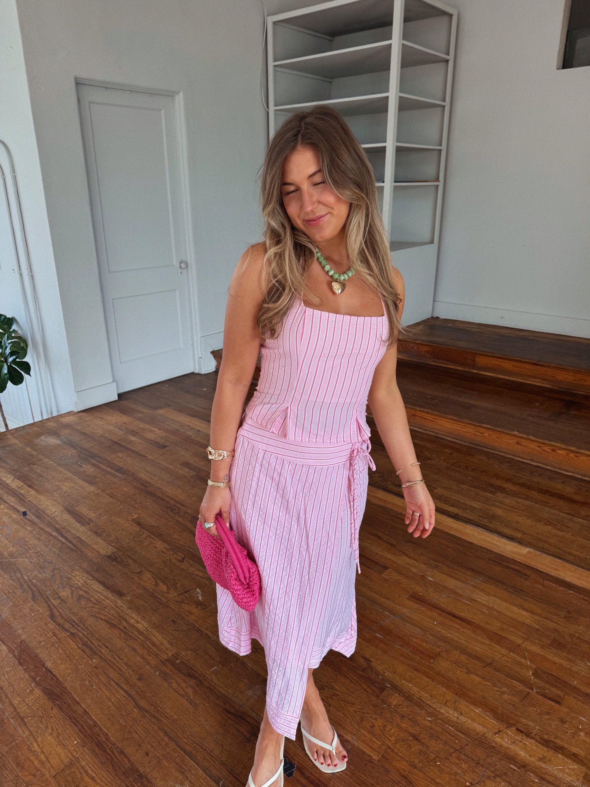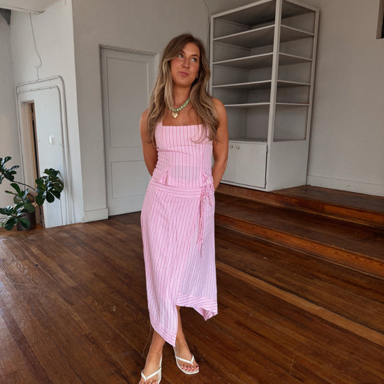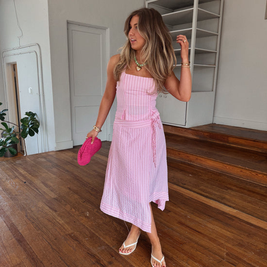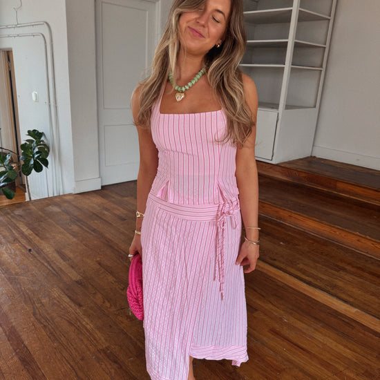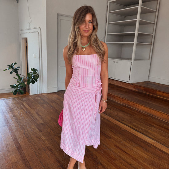 - pink striped asymmetrical midi skirt